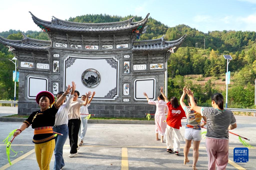 在湖南省桑植縣芙蓉橋白族鄉合群村,張丕和(左一)帶領(lǐng)村民學(xué)習白族舞蹈(9月8日攝)。
