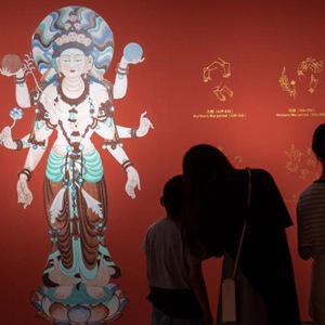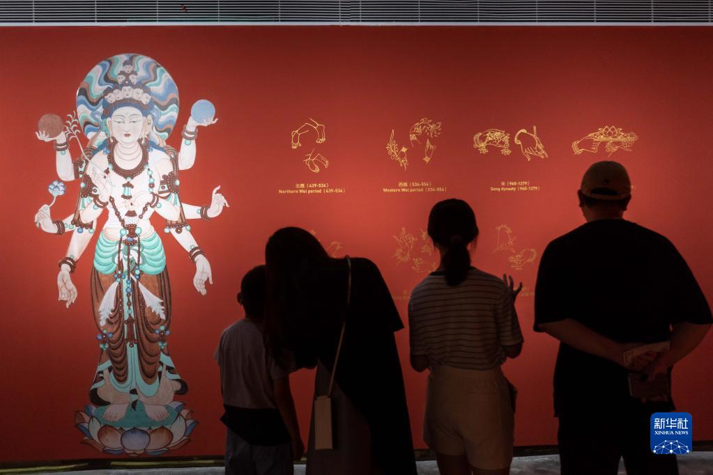 “遇見(jiàn)敦煌 光影藝術(shù)展”將于10月4日在遇見(jiàn)博物館·上海靜安館開(kāi)展。3日,部分媒體及觀(guān)眾提前參觀(guān)體驗。該展以敦煌文化藝術(shù)為核心,以藝術(shù)家重繪的200余幅敦煌石窟壁畫(huà)作品為基礎,通過(guò)3D光雕技術(shù)和數十臺4K超清設備,在投影面積達1300平方米的空間中展現敦煌石窟的藝術(shù)魅力,為觀(guān)眾帶來(lái)沉浸式體驗。新華社記者 王翔 攝