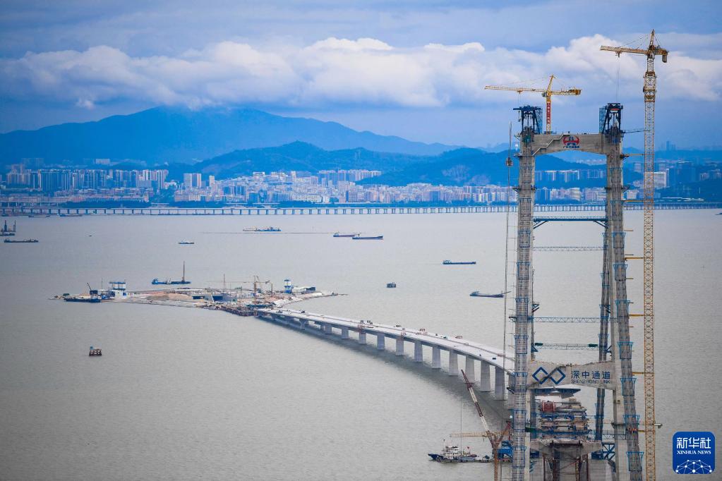 這是深中通道伶仃洋大橋東塔、西人工島及遠處的深圳市區(2022年6月7日攝)。