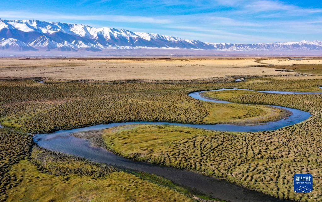 10月4日拍攝的新疆巴里坤哈薩克自治縣草原秋景(無(wú)人機照片)。
