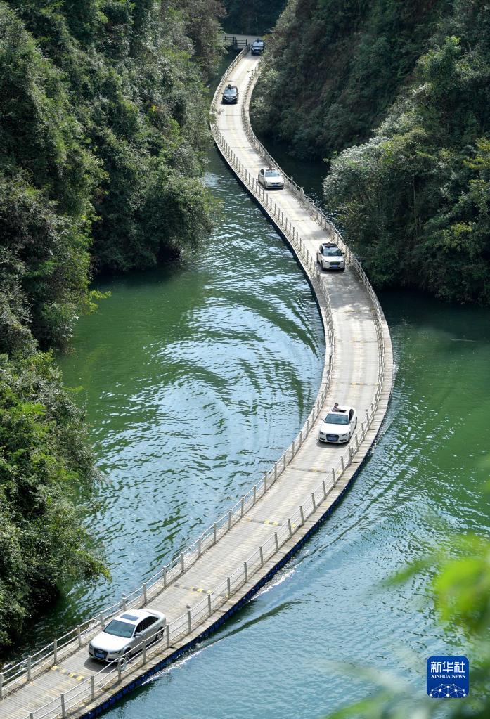 10月4日,游客駕車(chē)通過(guò)湖北省宣恩縣獅子關(guān)景區的水上棧道。