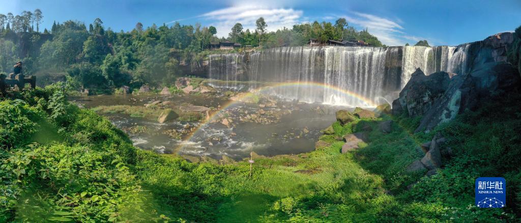 這是10月3日拍攝的四川廣安萬(wàn)春橋瀑布(無(wú)人機照片)。