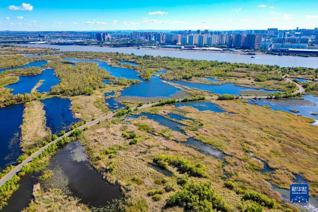這是10月4日拍攝的哈爾濱市阿勒錦島國家級濕地公園景色(無(wú)人機照片)。