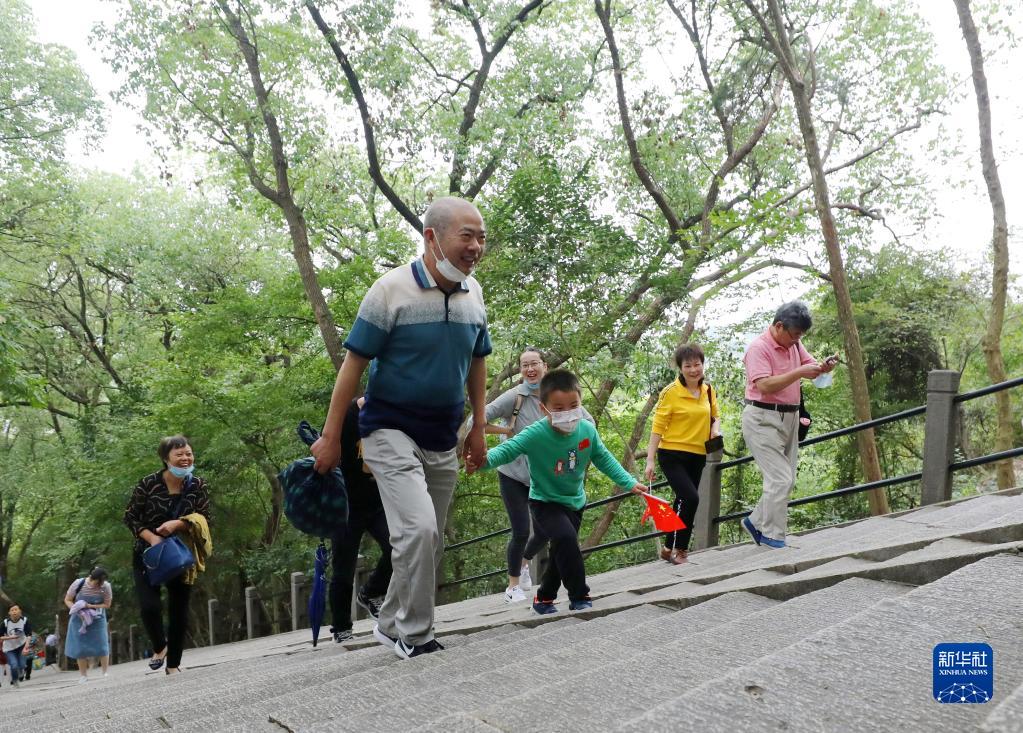 10月4日,老人牽著(zhù)孩子在上海佘山國家森林公園登山。