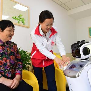 9月30日,在肥西縣上派鎮“愛(ài)和家”居家養老服務(wù)中心,工作人員為老人介紹智能機器人的使用方法。