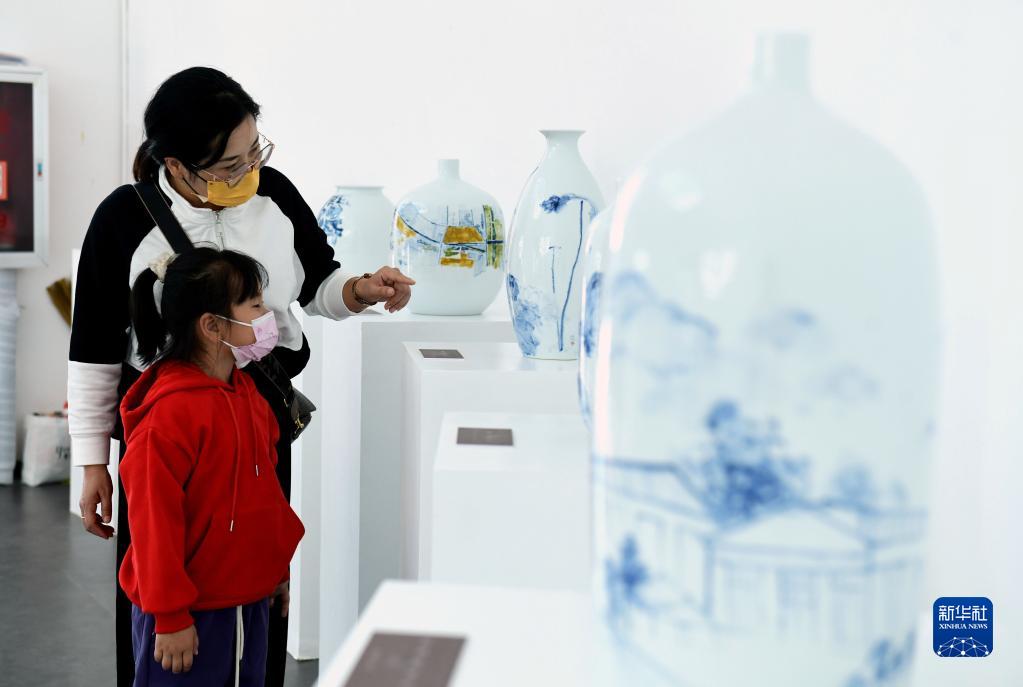 10月4日,游客在河北省石家莊市井陘縣秀林鎮南橫口村陶瓷水鎮展示中心參觀(guān)瓷器。