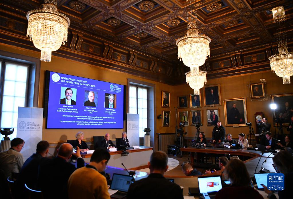 這是10月4日在瑞典斯德哥爾摩拍攝的2022年諾貝爾物理學(xué)獎公布現場(chǎng)。