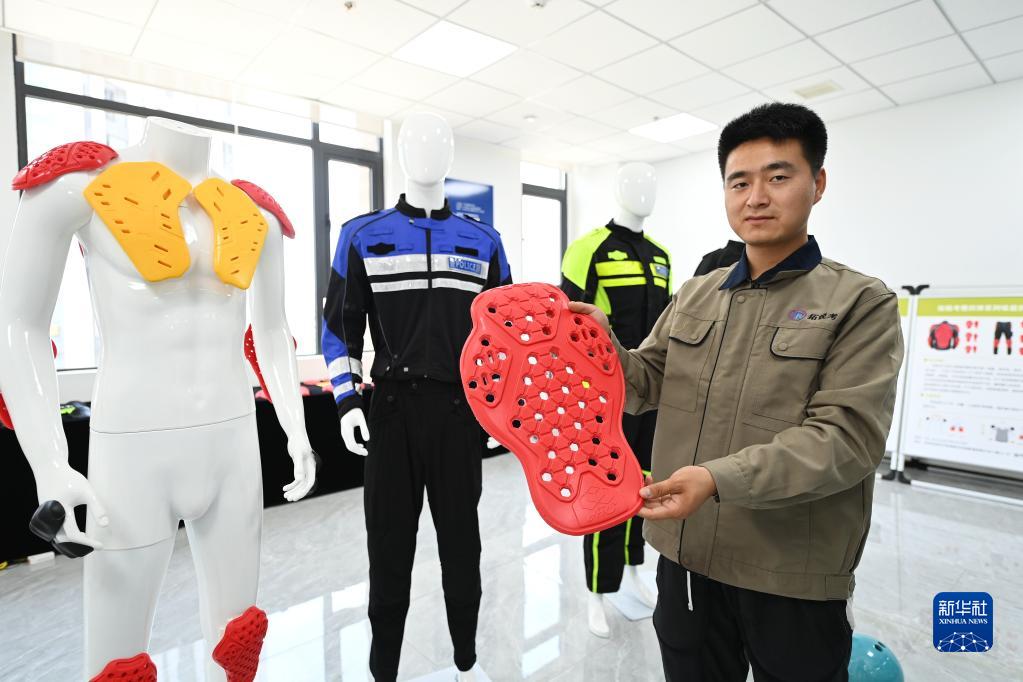 在位于秦創(chuàng )原總窗口所在地陜西省西咸新區的陜西拓銳考新材料科技有限公司,工作人員展示自主研發(fā)的納米智能吸能慢回彈護具(2022年6月17日攝)。新華社記者 李一博 攝