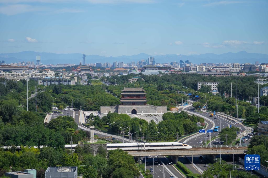 2022年8月16日,一列復興號高鐵列車(chē)從位于北京中軸線(xiàn)上的永定門(mén)城樓前駛過(guò)。