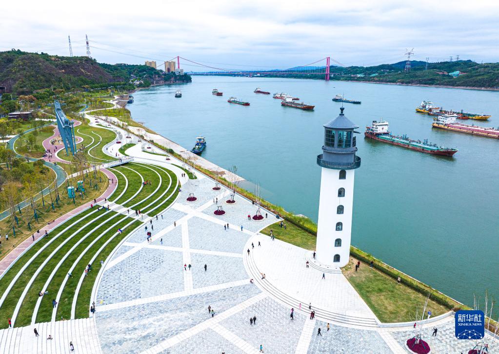 10月5日,市民在湖北省宜昌市濱江公園燈塔廣場(chǎng)游玩(無(wú)人機照片)。