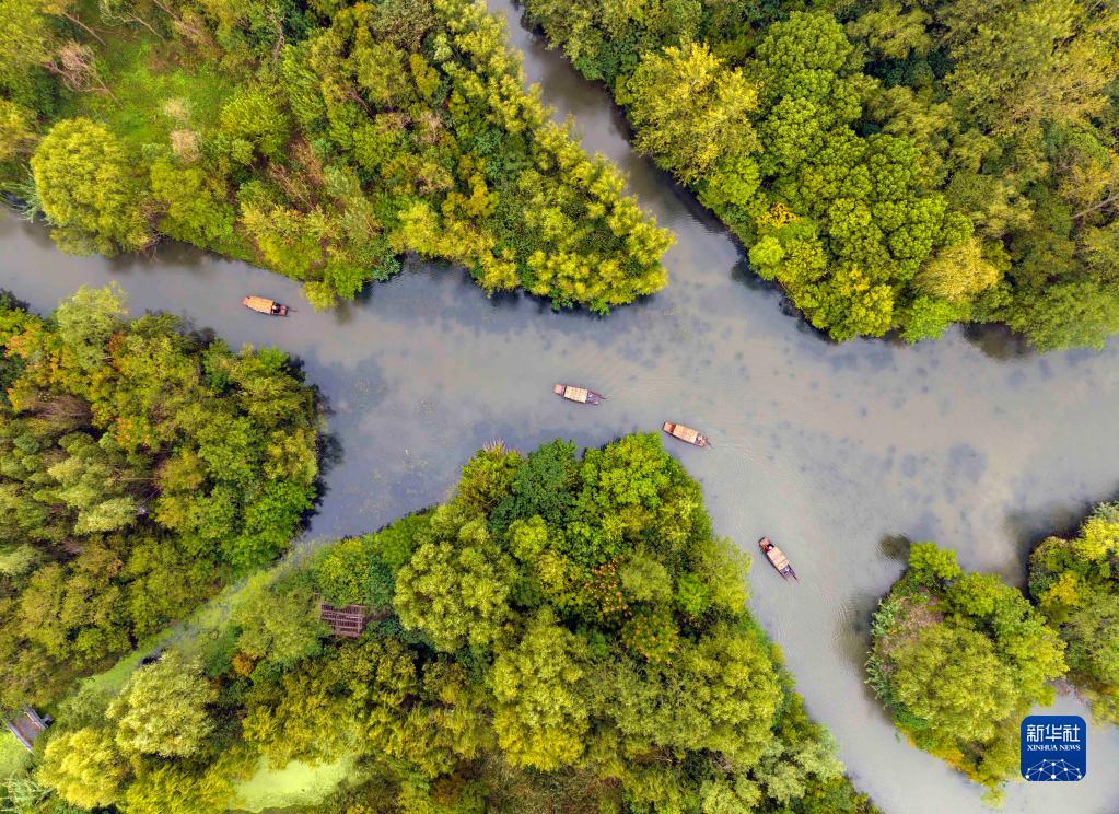10月5日,游客在位于江蘇省泰州市姜堰區的溱湖國家濕地公園乘船游玩(無(wú)人機照片)。