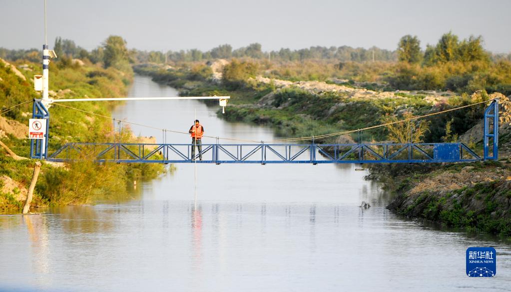 工作人員在新疆阿克蘇地區沙雅縣沙德克確了生態(tài)閘旁收集水文數據(2022年8月13日攝)。