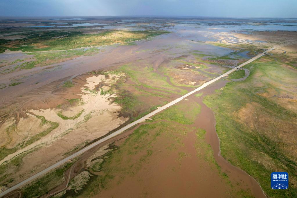 這是2022年8月19日拍攝的車(chē)爾臣河水流入臺特瑪湖(無(wú)人機照片)。