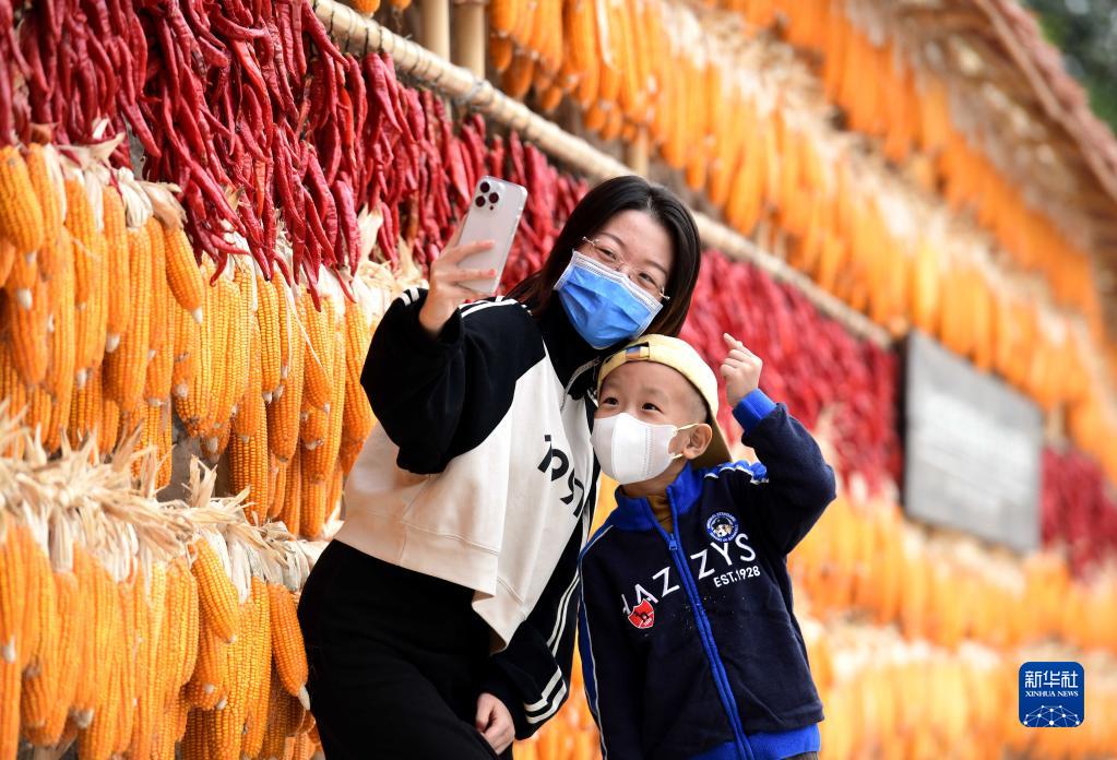 10月5日,在河北省石家莊市鹿泉區段莊村,游客與曬秋美景合影。