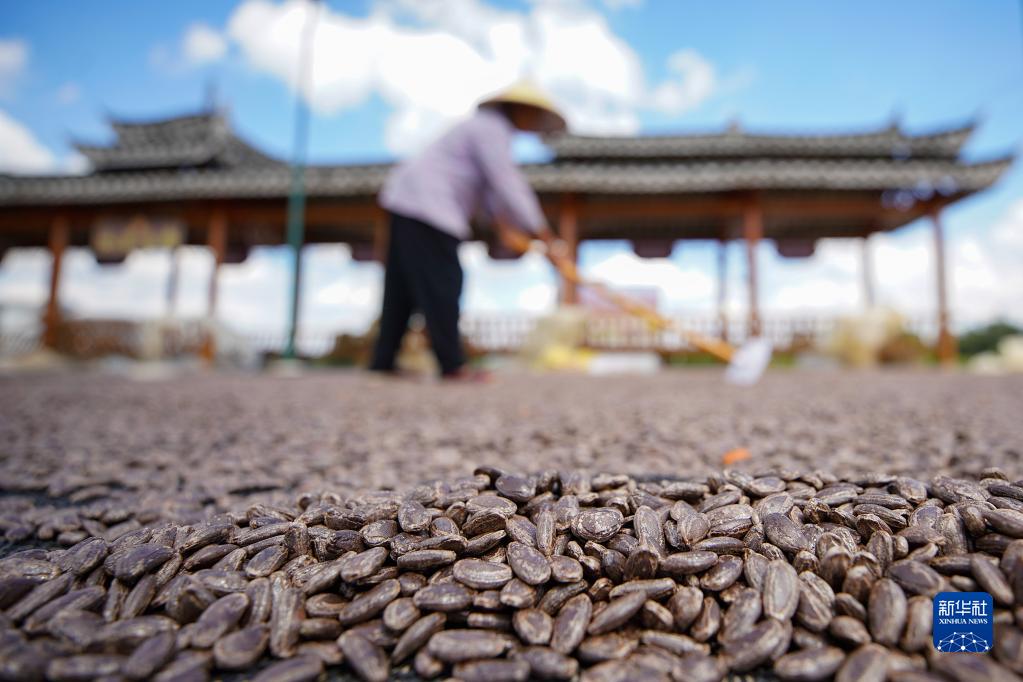 10月5日,貴州省黔東南苗族侗族自治州丹寨縣興仁鎮燒茶村村民在晾曬吊瓜子。