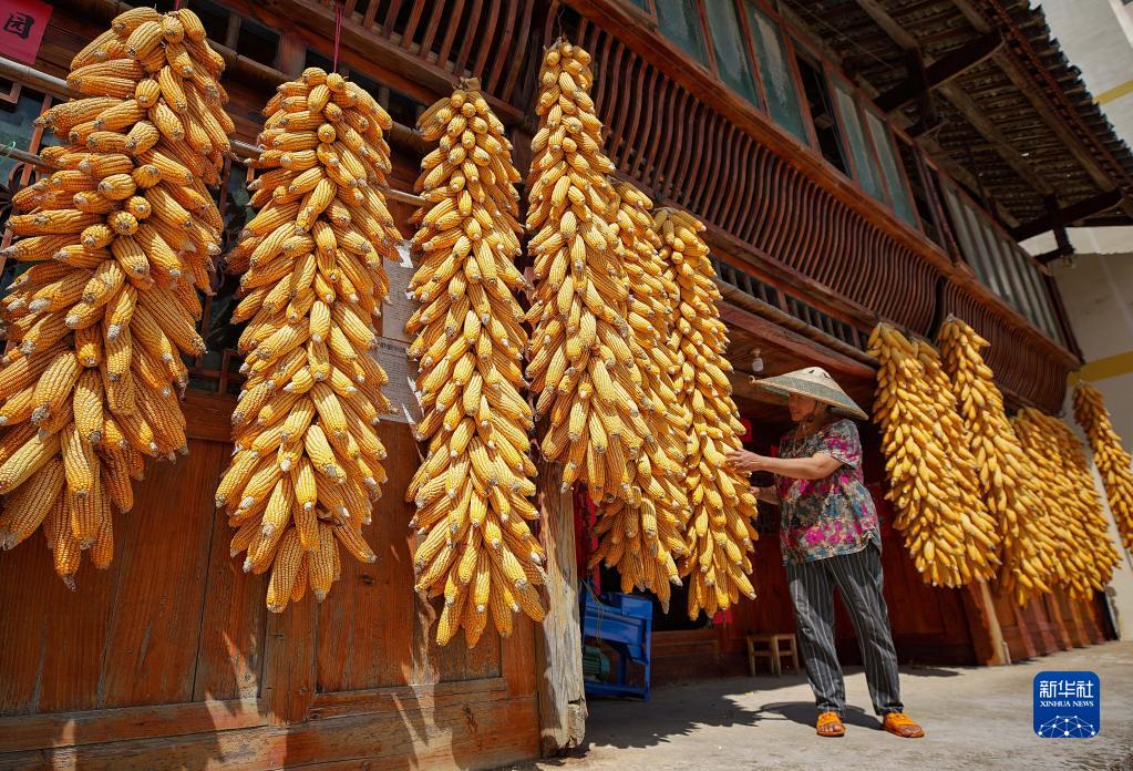 10月5日,貴州省黔東南苗族侗族自治州丹寨縣興仁鎮中營(yíng)村村民在晾曬玉米。