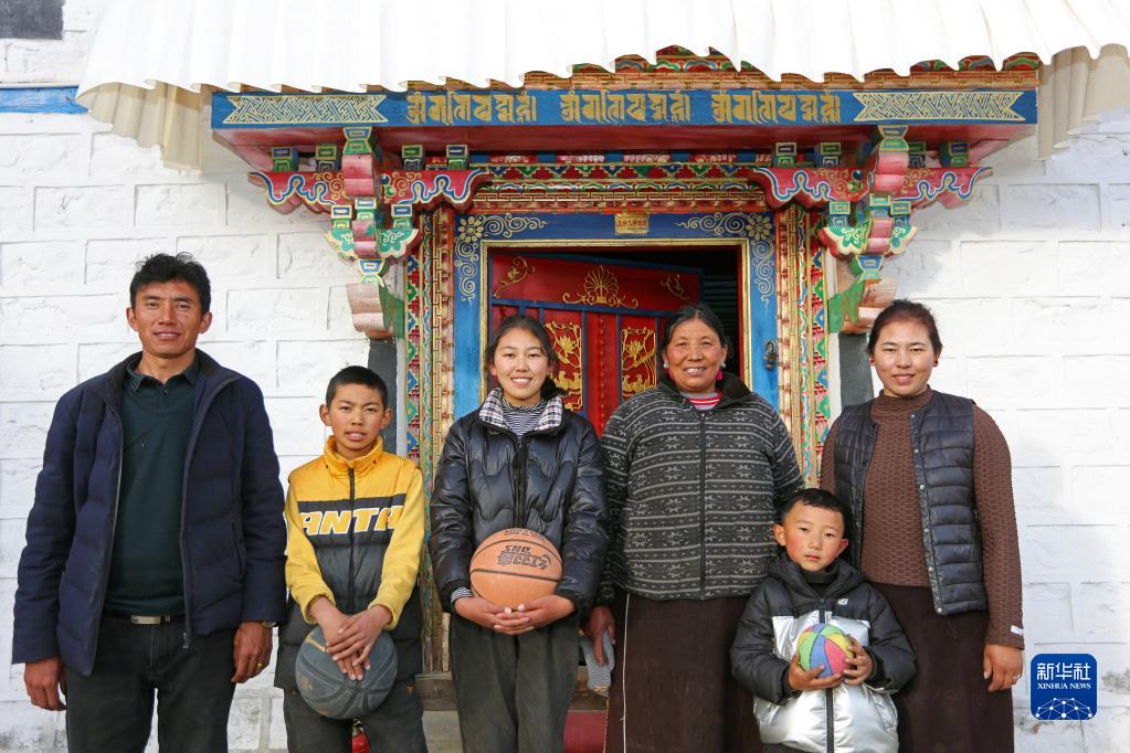 林芝市嘎拉村村民達瓦堅參(左一)一家在家門(mén)口合影(2022年2月23日攝)。新華社記者 姜帆 攝