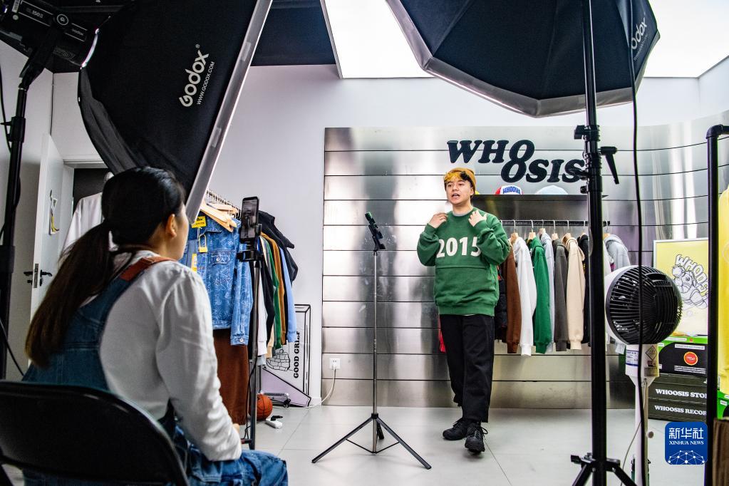 在重慶市渝中區由工業(yè)遺址改造成的“一廠(chǎng)影視園”一家國潮品牌公司內,創(chuàng )業(yè)者通過(guò)手機直播銷(xiāo)售商品(2022年9月27日攝)。