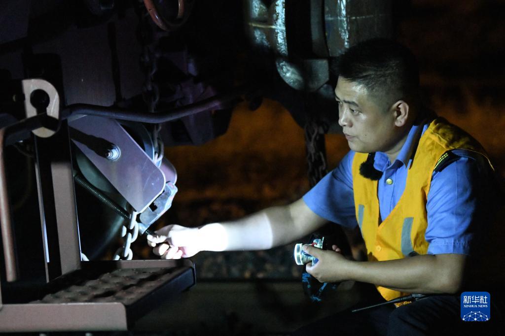 在百色車(chē)務(wù)段清水河西站,張天鹍在檢查列車(chē)防溜人力制動(dòng)機緊固器(10月4日攝)。
