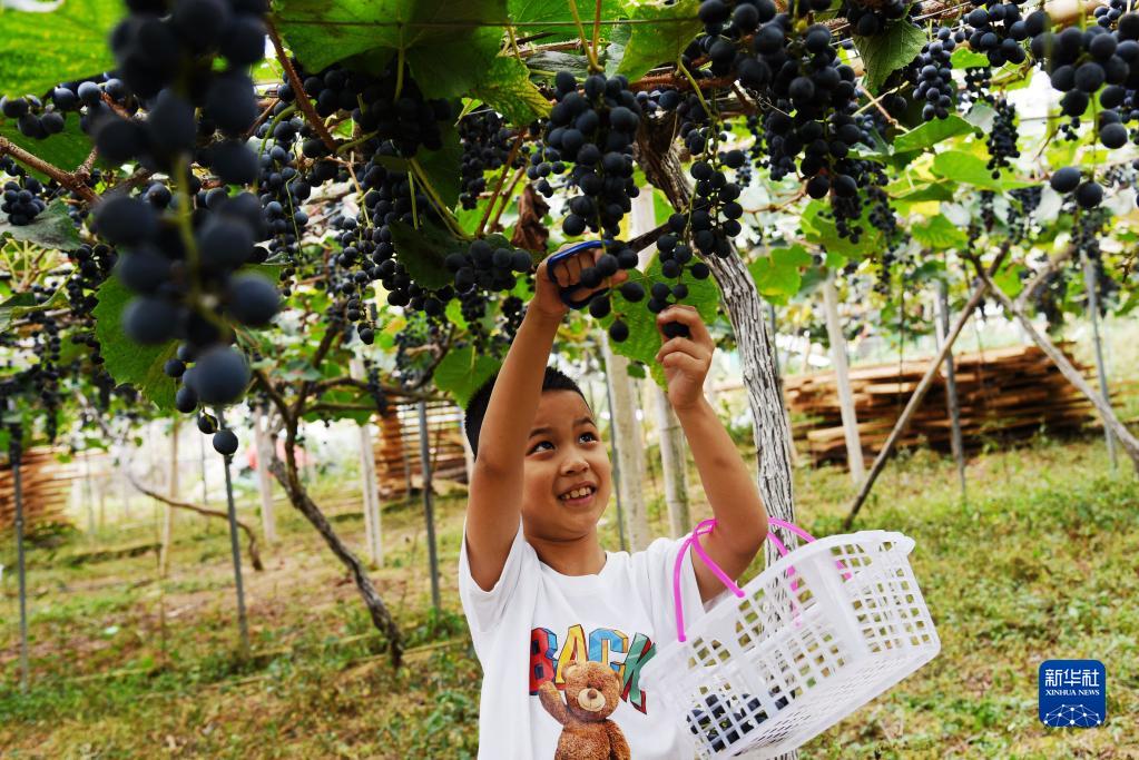 10月6日,小朋友在貴州省黔南布依族苗族自治州福泉市陸坪鎮羅坳村一處果園里采摘葡萄。