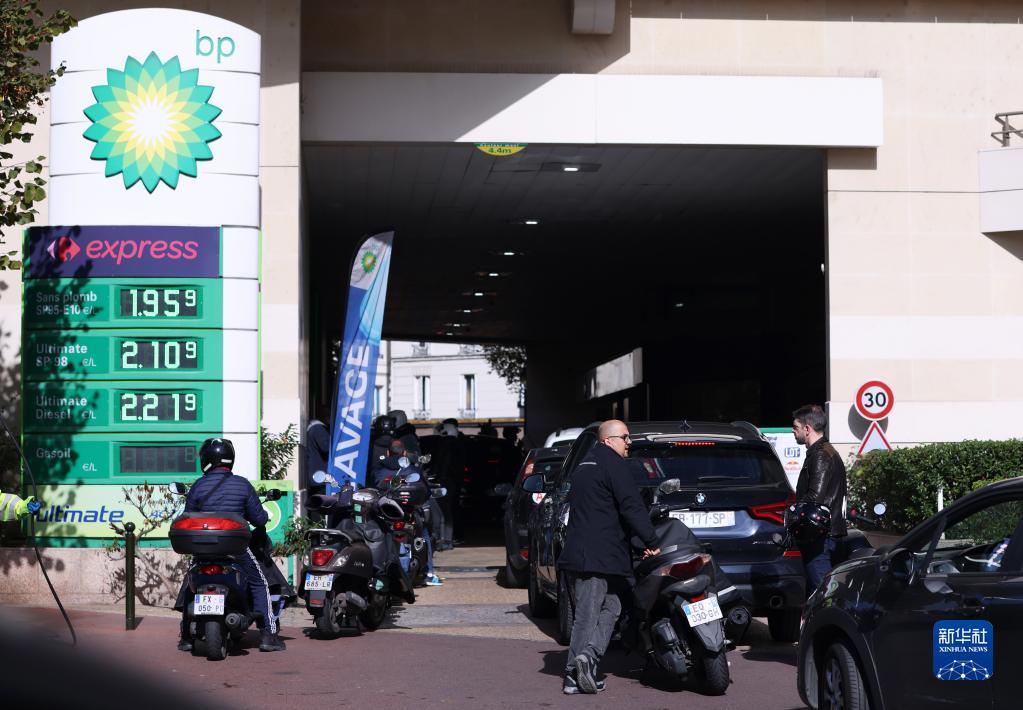 10月6日,在法國巴黎附近的勒瓦盧瓦,一處BP石油公司的加油站前排起長(cháng)隊。