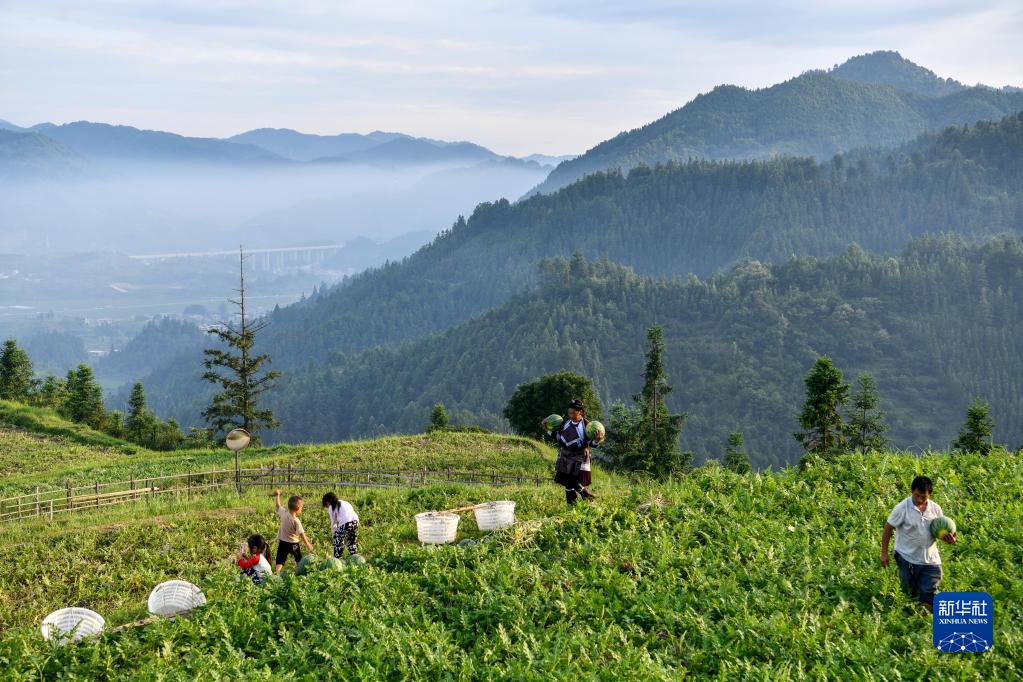 貴州省榕江縣忠誠鎮苗本村的農民在梯田上收獲西瓜(2022年7月16日攝)。新華社記者 楊文斌 攝