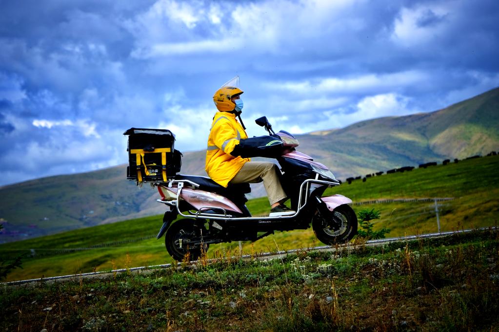 “最近好多商家爆單,我們經(jīng)常要送到電瓶車(chē)耗完電?!奔谉崴诘耐赓u(mài)站點(diǎn)共有7名騎手,擔負著(zhù)整個(gè)色達縣城及周邊地區的配送任務(wù)。在縣城的大馬路上,在街角巷子口,甚至城外的金馬草原上,時(shí)常能看到他們穿梭的身影。
