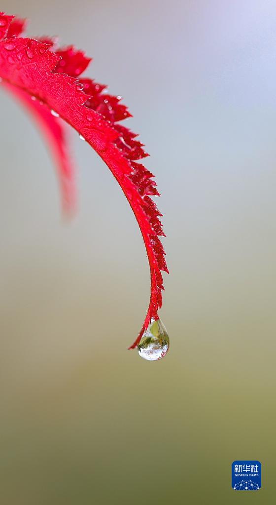 貴州省黔東南苗族侗族自治州丹寨縣,楓葉上掛著(zhù)露珠(10月2日攝)。
