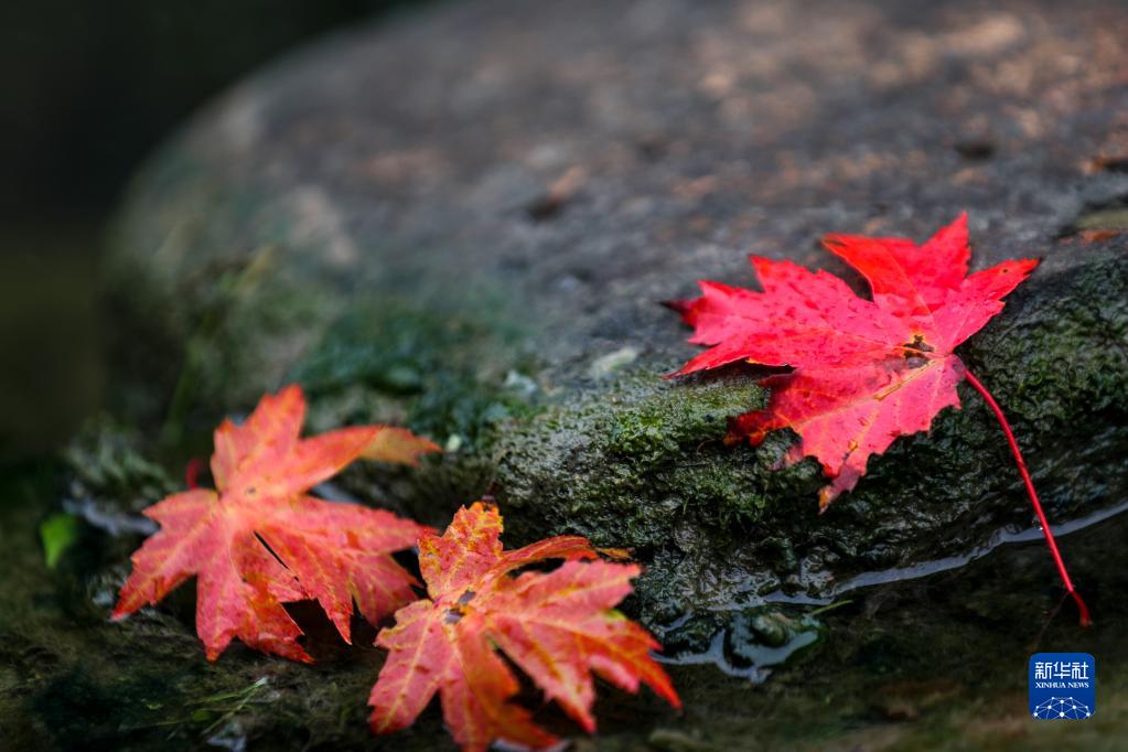 在江蘇省揚州市瘦西湖風(fēng)景區,楓葉飄落(10月1日攝)。