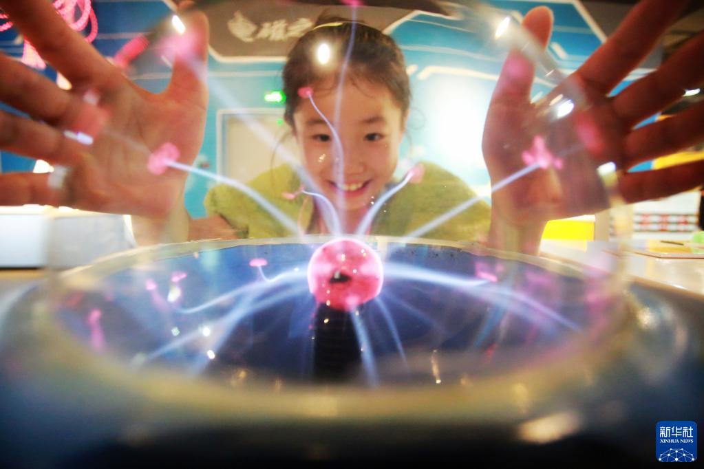 10月1日,在江蘇揚州科技館,小朋友在體驗“輝光球”。