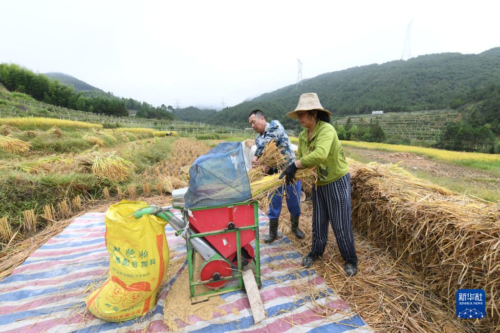 10月8日,在福建省寧德市蕉城區虎貝鎮下樓村,村民在田間打稻谷。新華社發(fā)(王旺旺 攝)