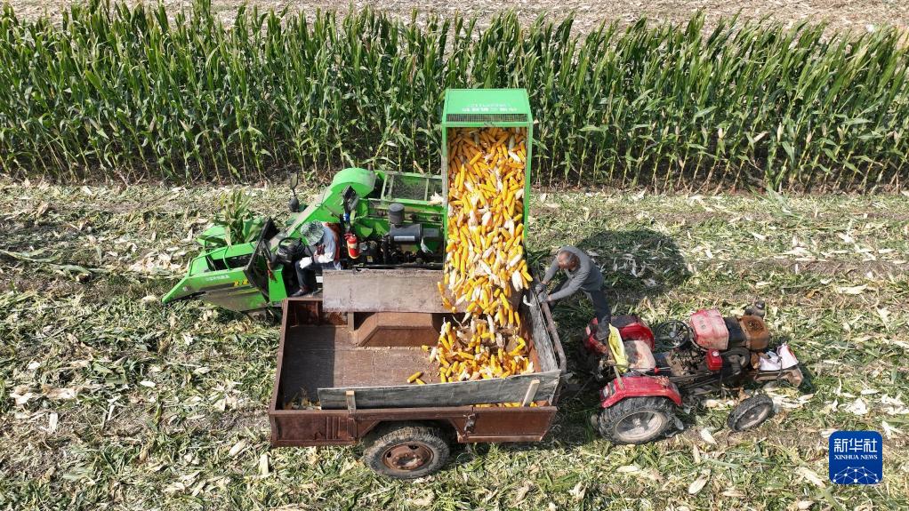 10月8日,農民在山東省聊城市茌平區杜郎口鎮陳莊村收獲玉米(無(wú)人機照片)。新華社發(fā)(馬紅坤 攝)