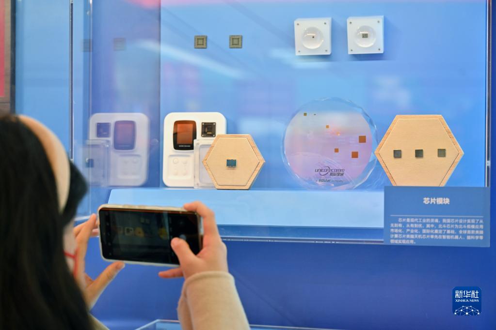 10月8日,一名觀(guān)眾拍攝名為“方寸之間”的陳列墻上的芯片模塊展示。新華社記者 李鑫 攝
