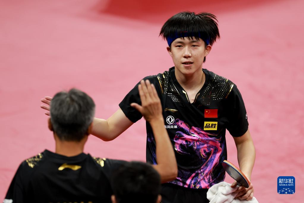 10月9日,中國隊選手王楚欽(右)在獲勝后與教練秦志戩擊掌,他以3比0戰勝德國隊選手凱·斯達姆珀。新華社記者 胥冰潔 攝