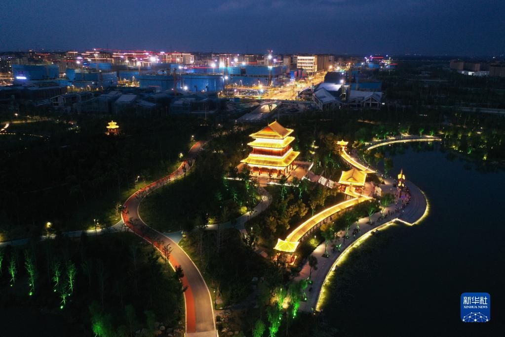 2022年7月28日拍攝的雄安新區容東片區金湖公園夜景(無(wú)人機照片)。
