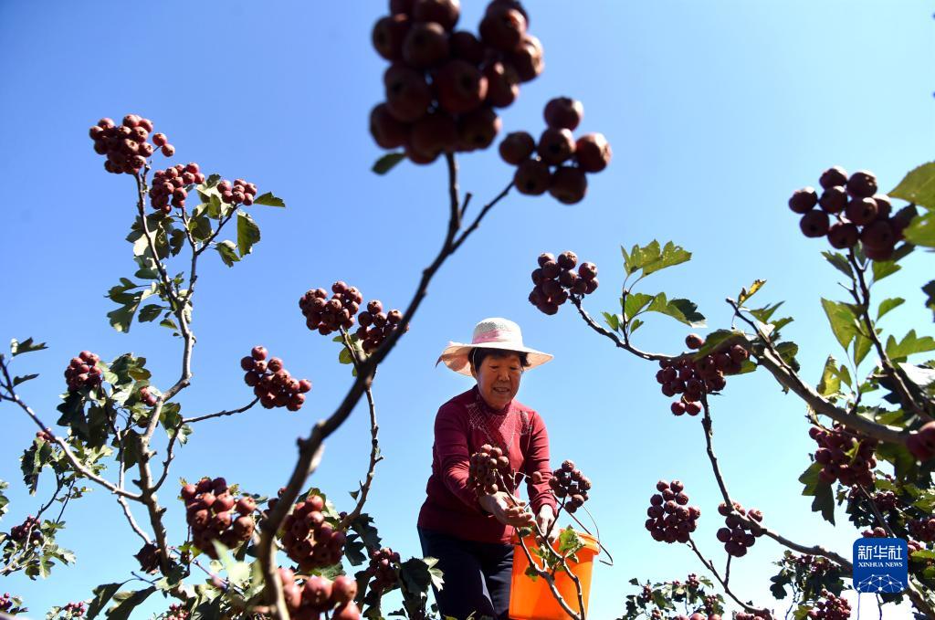 10月10日,山東省淄博市沂源縣悅莊鎮崔家莊村的農民在采摘山楂。