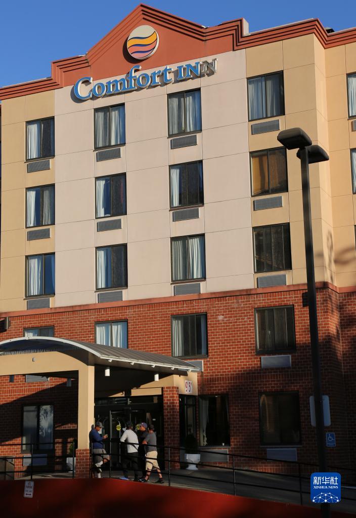 10月9日,尋求庇護者在美國紐約市斯塔滕島“舒適”旅館外等待當地居民送來(lái)衣物等用品。