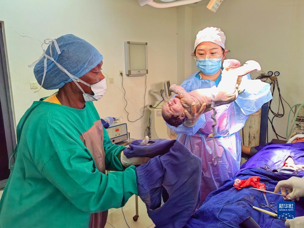 7月25日,在蘇丹杰濟拉州哈薩海薩市阿布歐舍鎮的阿布歐舍友誼醫院,中國醫療隊隊員與當地醫務(wù)人員為患者實(shí)施手術(shù)并接生新生兒。