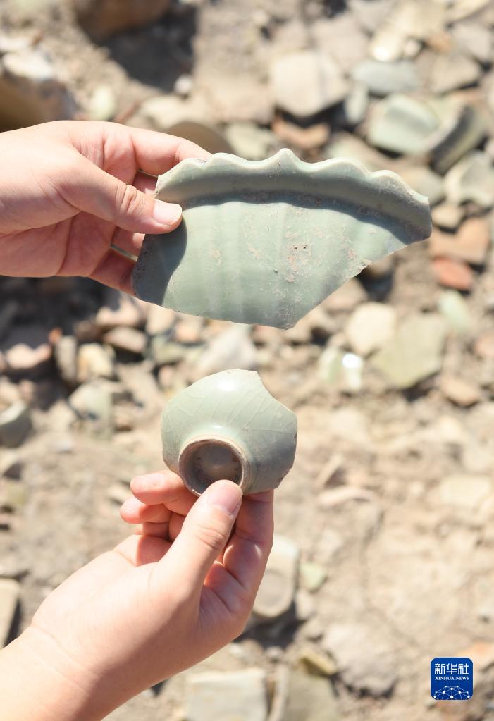 10月10日,考古工作人員在發(fā)掘現場(chǎng)展示兩塊青瓷片。