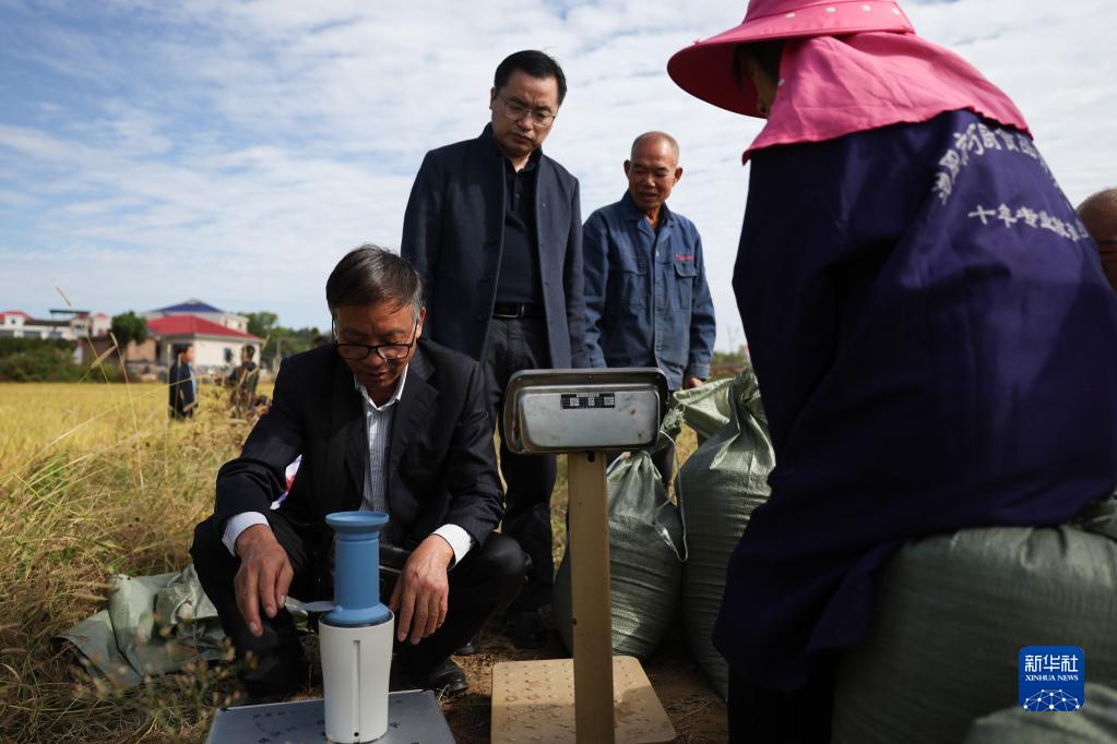 10月11日,工作人員在測產(chǎn)驗收現場(chǎng)檢測稻谷含水量。
