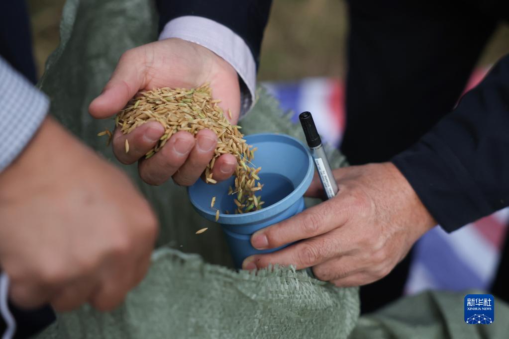 10月11日,工作人員在測產(chǎn)驗收現場(chǎng)檢測稻谷含水量。