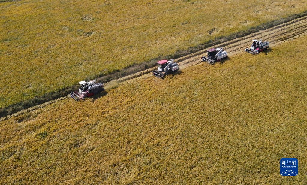 10月11日,在安徽省蕪湖市繁昌區新港鎮,村民駕駛收割機收割水稻(無(wú)人機照片)。