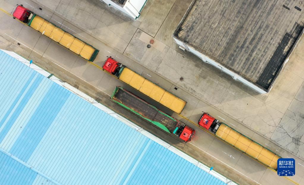在中央儲備糧天津東麗直屬庫有限公司大港分公司,運糧車(chē)在庫區倉房間駛過(guò)(10月12日攝,無(wú)人機照片)。