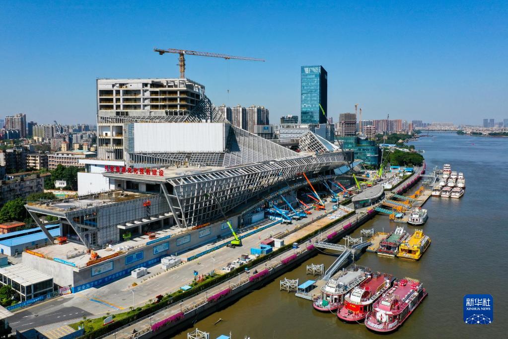 廣東美術(shù)館、廣東非物質(zhì)文化遺產(chǎn)展示中心、廣東文學(xué)館“三館合一”建筑長(cháng)350米,高近80米,宛如一艘“文化巨輪”揚帆珠江(10月12日攝,無(wú)人機照片)。