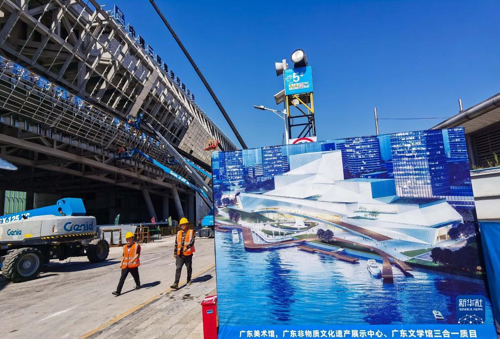 建設者從廣東美術(shù)館、廣東非物質(zhì)文化遺產(chǎn)展示中心、廣東文學(xué)館“三館合一”項目效果圖旁經(jīng)過(guò)(10月12日攝)。