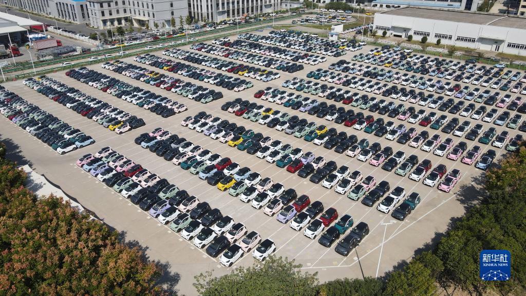10月12日在位于蕪湖市的奇瑞汽車(chē)股份有限公司新能源一期工廠(chǎng)拍攝的等待交付的新能源汽車(chē)(無(wú)人機照片)。