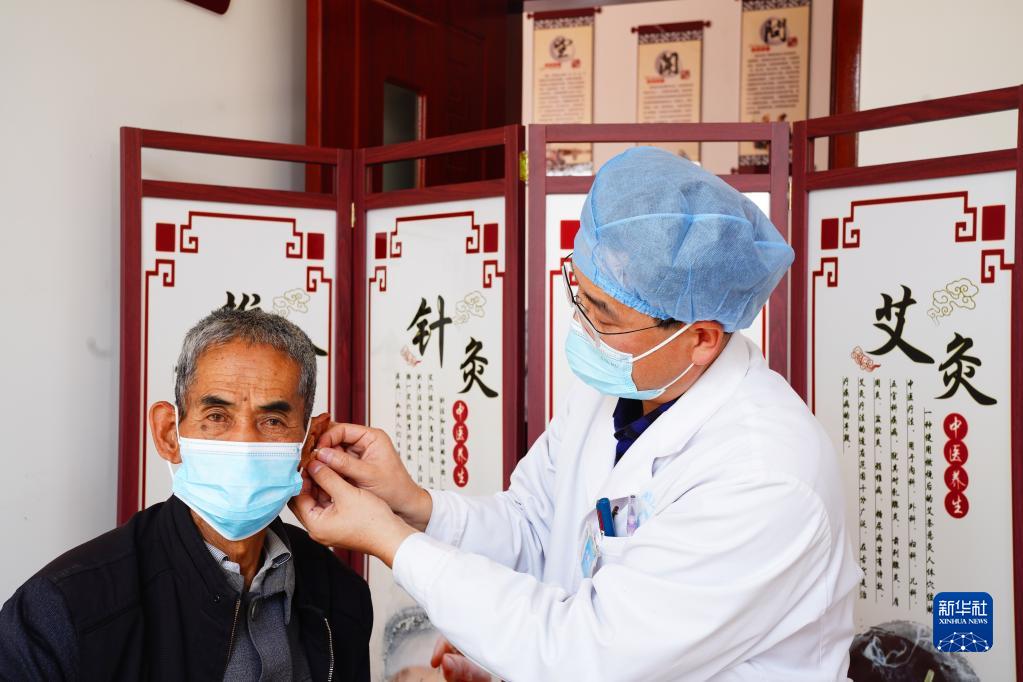 10月13日,在五蓮縣松柏鎮衛生院“國醫堂”,醫生在為患者做撳針治療。