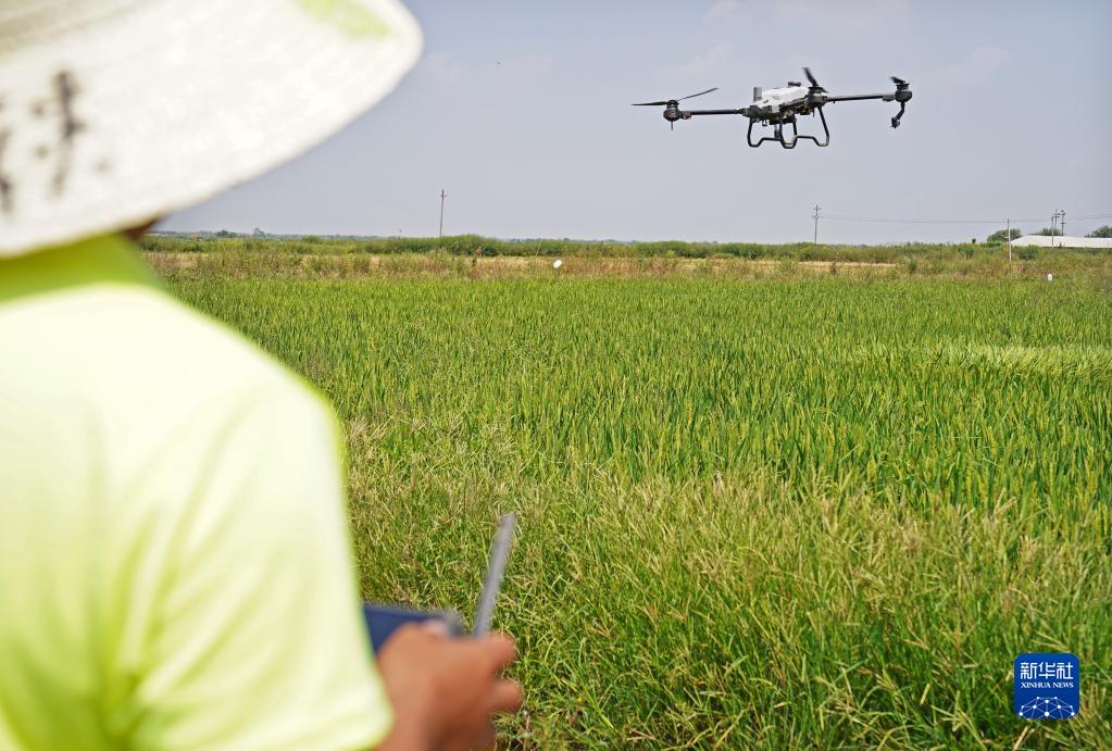 在江西省南昌縣大田農社,農民操控無(wú)人機為稻田施肥(9月16日攝)。