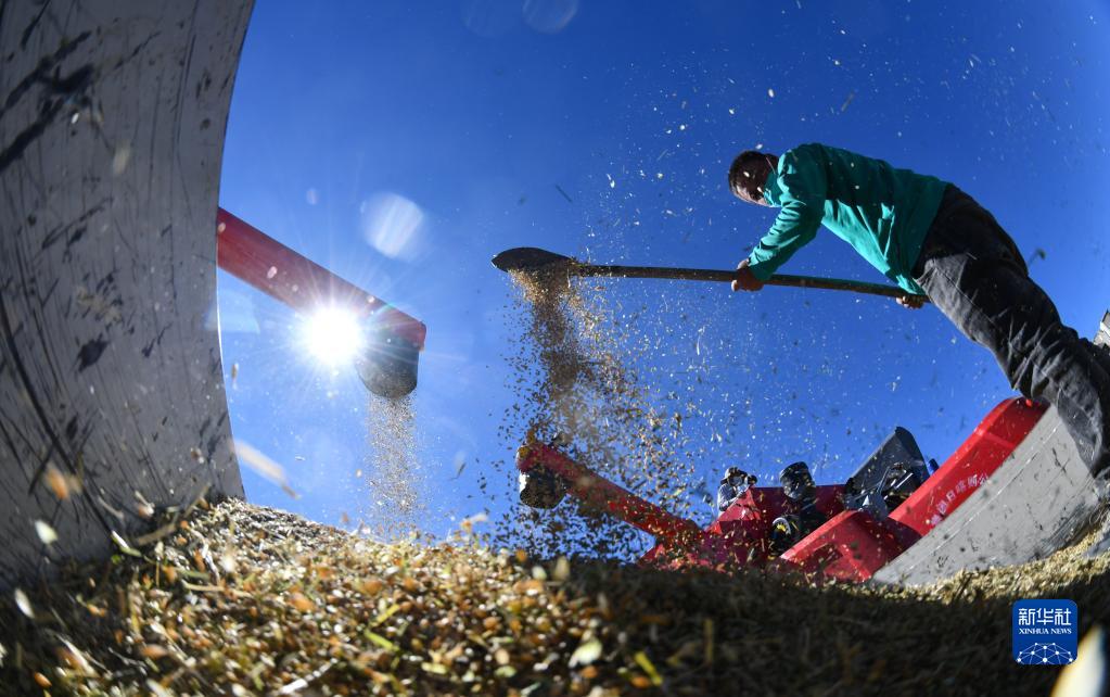 西藏日喀則市江孜縣熱索鄉努康村農機合作社的村民在整理收割機收獲的小麥(2022年9月19日攝)。