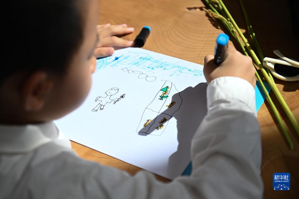 10月14日,湖州市吳興高新區中心幼兒園的小朋友在靈糧農場(chǎng)以水稻為主題進(jìn)行繪畫(huà)。